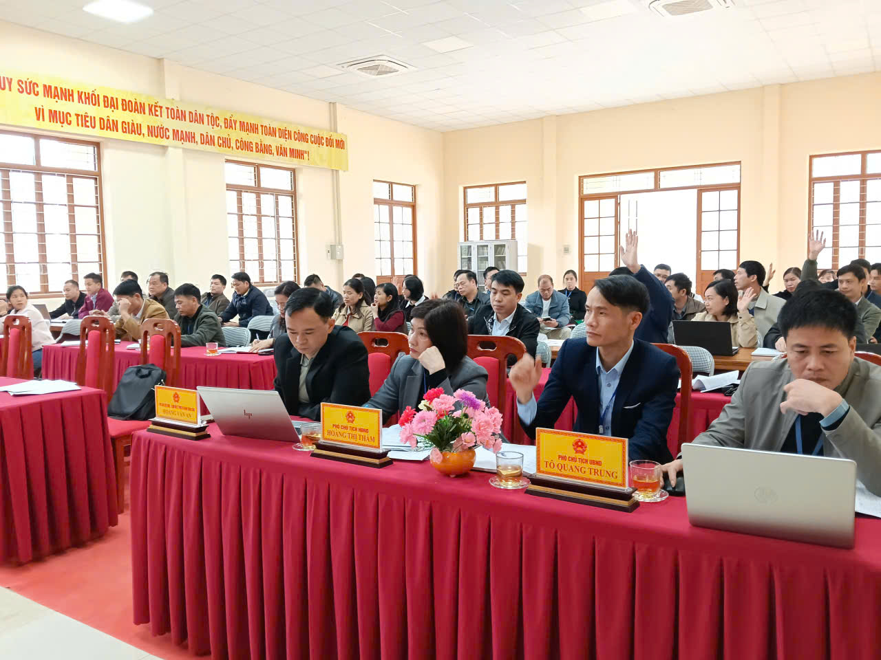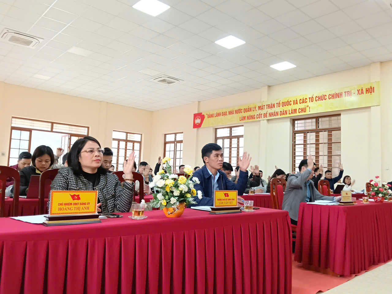 Đồng chí Hoàng Thị Thắm – Đảng ủy viên, Phó chủ tịch HĐND xã; Đồng chí Hoàng Văn An - Ủy viên BTV, Phó chủ tịch UBND xã; Đồng chí Vi Văn Điền – Chánh VP HĐND&UBND; Đồng chí Hoàng Mạnh Hải - trưởn phòng Văn hóa và toàn thể cán bộ công chức các cơ quan Đảng, HĐND, UBND, Ủy Ban MTTQ Việt Nam dự hội nghị