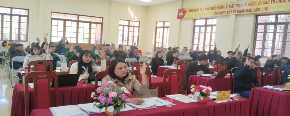 Các đại biểu HĐND xã biểu quyết thông qua các Nghị quyết HĐND xã.