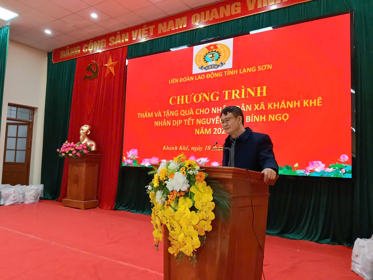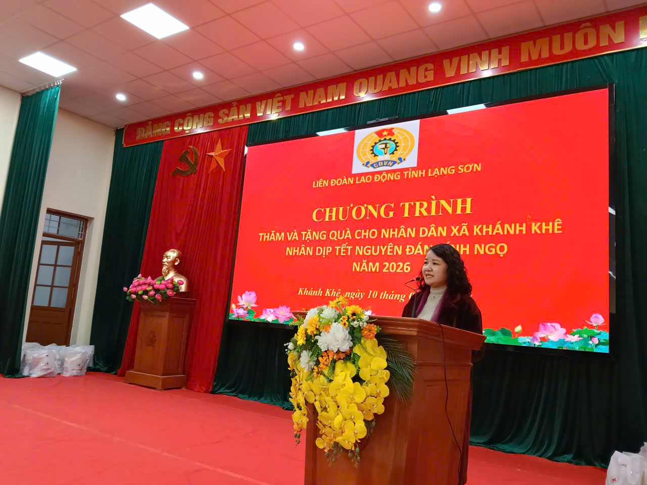 Phát biểu tại chương trình, đồng chí Bế Thị Hòa, Tỉnh ủy viên, Phó Chủ tịch Ủy ban Mặt trận Tổ quốc Việt Nam tỉnh, Chủ tịch Liên đoàn Lao động tỉnh Lạng Sơn ghi nhận và đánh giá cao sự chủ động, tích cực của cấp ủy, chính quyền xã Khánh Khê trong công tác chăm lo an sinh xã hội cho Nhân dân dịp Tết. Đồng chí nhấn mạnh, hoạt động thăm, tặng quà Tết thể hiện truyền thống tốt đẹp “tương thân tương ái” của dân tộc; đồng thời mong muốn các hộ gia đình tiếp tục nỗ lực vươn lên trong cuộc sống, phát huy tinh thần đoàn kết, chung sức xây dựng quê hương ngày càng phát triển. Nhân dịp năm mới, đồng chí gửi lời chúc mừng năm mới an khang, hạnh phúc và đón Tết Nguyên đán Bính Ngọ năm 2026 vui tươi, đầm ấm tới toàn thể Nhân dân trên địa bàn xã.