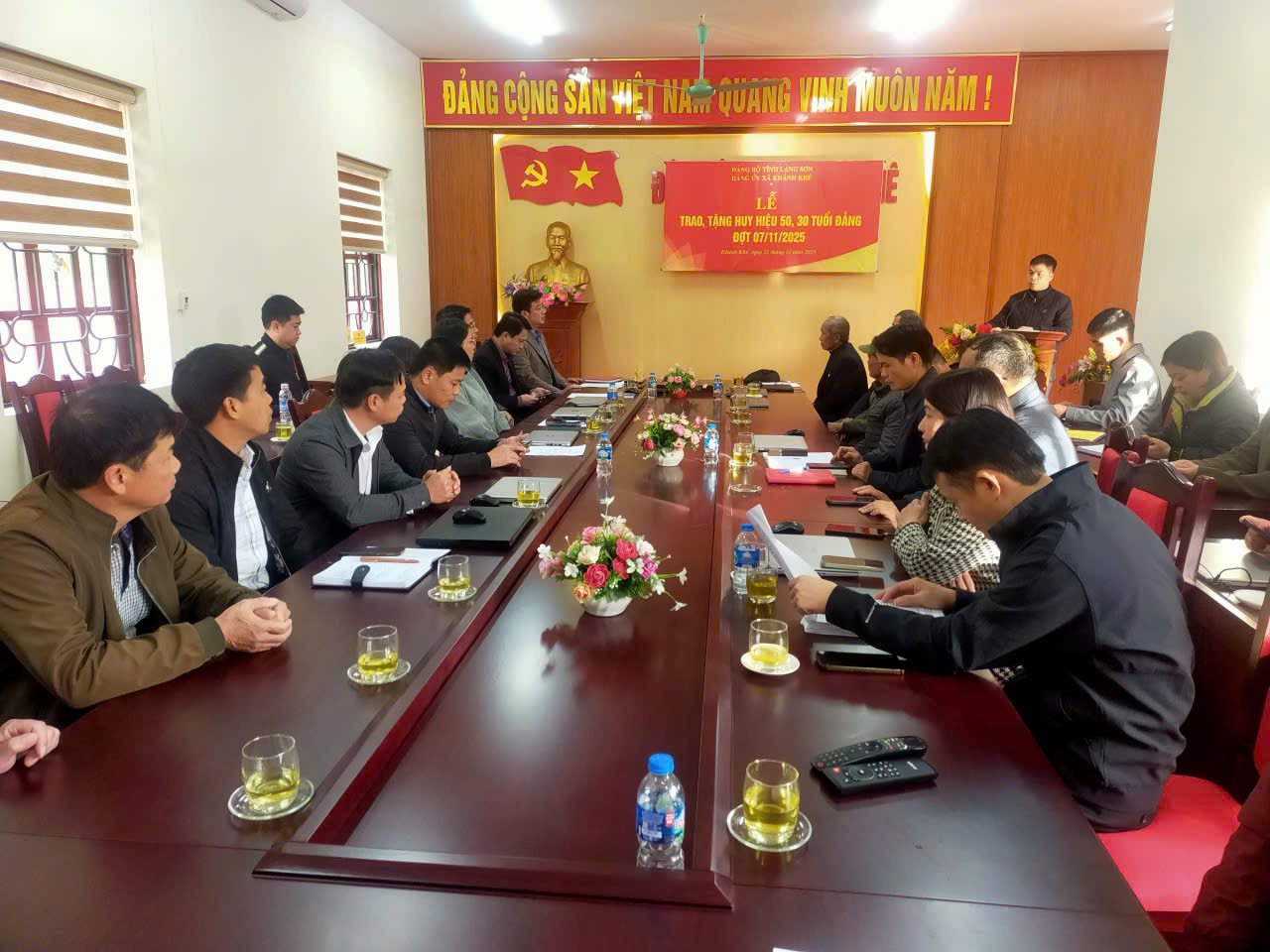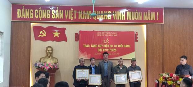 Chiều ngày 22/11/2025, Đảng bộ xã Khánh Khê tổ chức Lễ trao tặng Huy hiệu Đảng cho Đảng viên được tặng Huy hiệu Đảng đợt 07/11/2025 (Đợt 4 năm 2025). Dự buổi lễ có Đồng chí Nguyễn Mạnh Tuấn, Bí thư Đảng ủy, Chủ tịch HĐND xã; Đồng chí Liễu Văn Hoàng, Phó bí thư Thường trực Đảng ủy xã; Đồng chí Triệu Đức Dũng, Phó Bí thư Đảng ủy, Chủ tịch UBND xã; các đồng có các đồng chí Ủy viên Ban Chấp hành, Ủy viên Ban Thường vụ Đảng ủy xã, Lãnh đạo, Đảng ủy, HĐND; UBND; UBMTTQ; lãnh đạo các Phòng, ban, các tổ chức chính trị - xã hội xã, các cơ quan tham mưu giúp việc cho Đảng ủy xã và các đồng chí đảng viên được tặng huy hiệu Đảng.